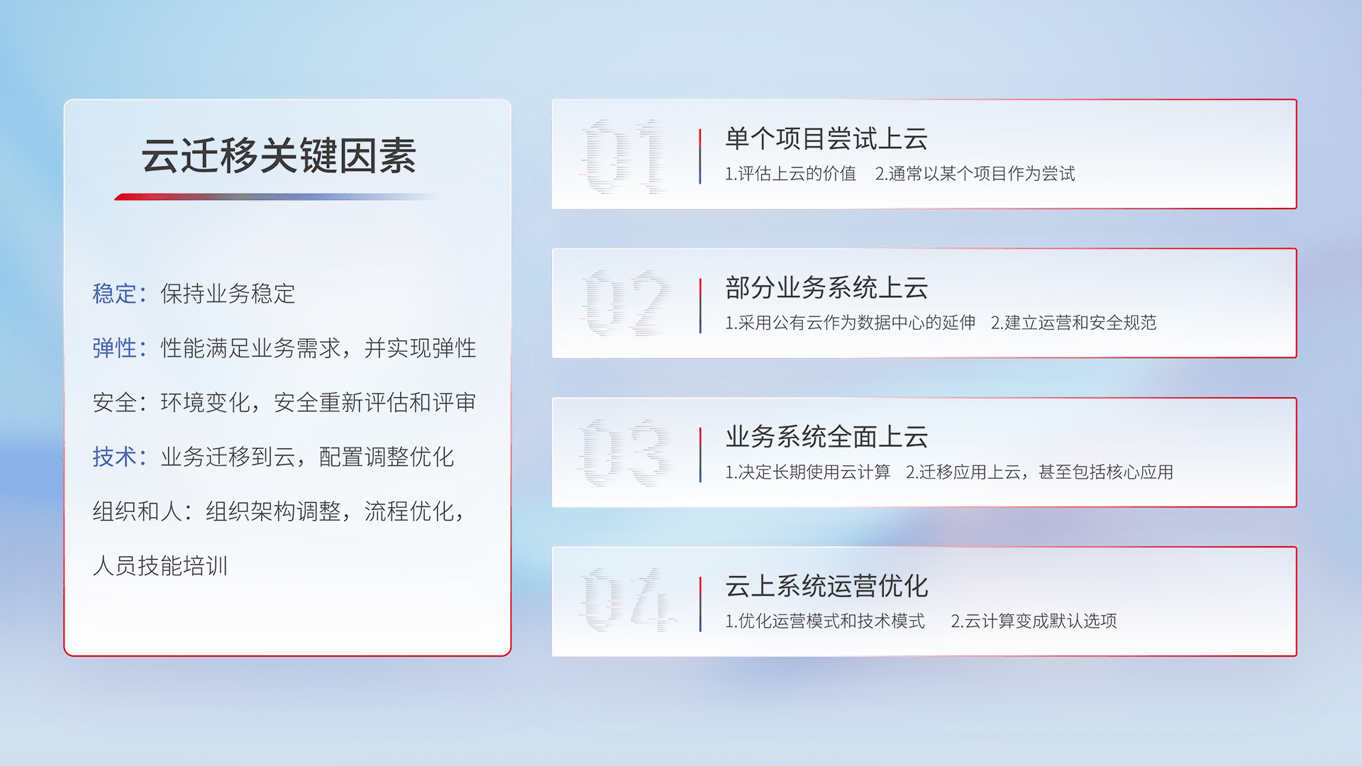 结合实际业务,,从规划设计、、、云平台选型、、、、云原生改造、、数据迁移、、、集成交付,,,迁移全过程为客户识别最佳上云路径,,,,做好风险识别管理,,,,设计网络架构、、、、身份权限、、、、安全审计合规、、、操作审计、、、日志审计、、、、监控告警策略、、、多站点容灾设计等,,,,对云上基础设施进行整体规划,,,提升IT治理水平,,,,以满足弹性、、、高可用、、、高性能的需求。。。。