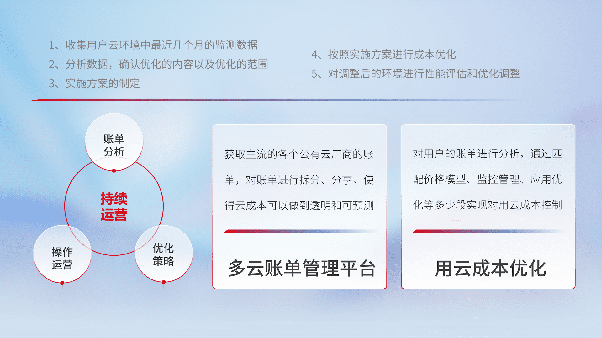 通过多云纳管,,以统一的资源数据模型把客户的云资源进行抽象和封装,,,,进而实现对多云资源的统一操作,,,保障云资源管理的可靠性、、、、稳定性与可用性。。量身定制化运维内容,,,配置、、、开发运维、、、、补丁管理、、、、备份、、、监控、、、、认证和访问管理、、、、审计和日常巡检等,,,,保障在用云过程中的可靠度,,稳定度以及高可用率。。
